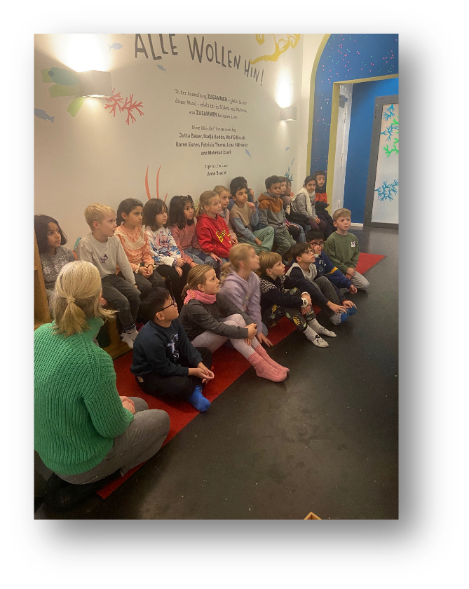 Im Kinderbuchhaus haben wir Lena getroffen. Zuerst sollten wir erraten welches Bild Lena gemalt hat. Wir haben einen magischen Stift bekommen und dann haben wir den magischen Stift rumgegeben und jeder, der den Stift bekommen hat, durfte etwas zu dem Bild von Lena Hällmayer sagen. Wir haben darüber gesprochen was das Bild bedeuten kann. Auf dem Bild sieht man geflochtene Fäden und Fäden mit losen Enden, auf dem Bild waren auch viele Kinder zu sehen.