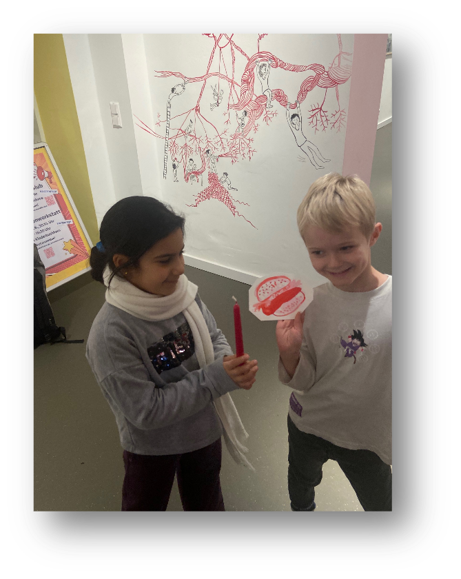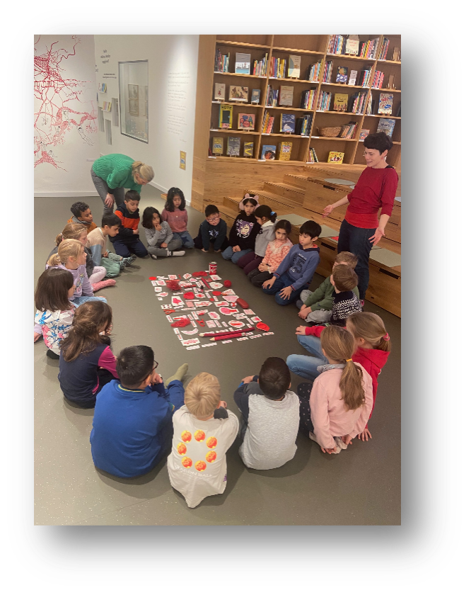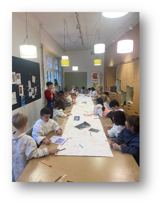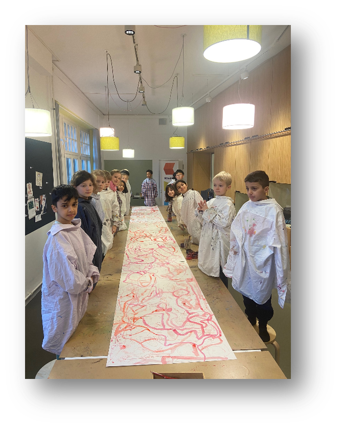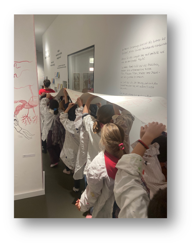 Wir haben einen Ausflug in das Kinderbuchhaus in Altona gemacht. Dort haben wir zusammen mit der Illustratorin und Autorin Lena Hällmayer das Kinderbuchhaus kennengelernt und zusammen mit ihr etwas Besonderes entstehen lassen, ein riesiges Leporello.