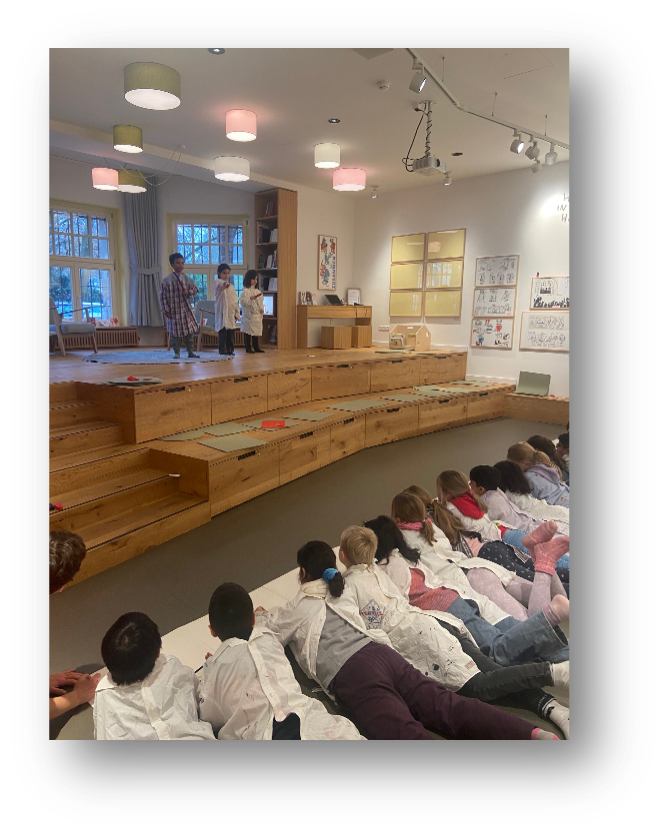 Immer drei Kinder gingen auf die Bühne. Die Kinder auf der Bühne haben mit den magischen Stiften in die Luft gezeichnet und wir, die anderen Kinder, mussten das, was die Kinder in die Luft zeichneten, auf einem langen Blatt aufzeichnen. Das war witzig und hat viel Spaß gemacht.
